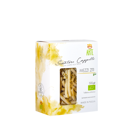 Pasta di semola di grano duro biologico Senatore Cappelli autoprodotto sui campi dell'Azienda Agricola Arte, trafilatura al bronzo e lentissima essiccazione sotto i 32° C.