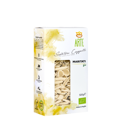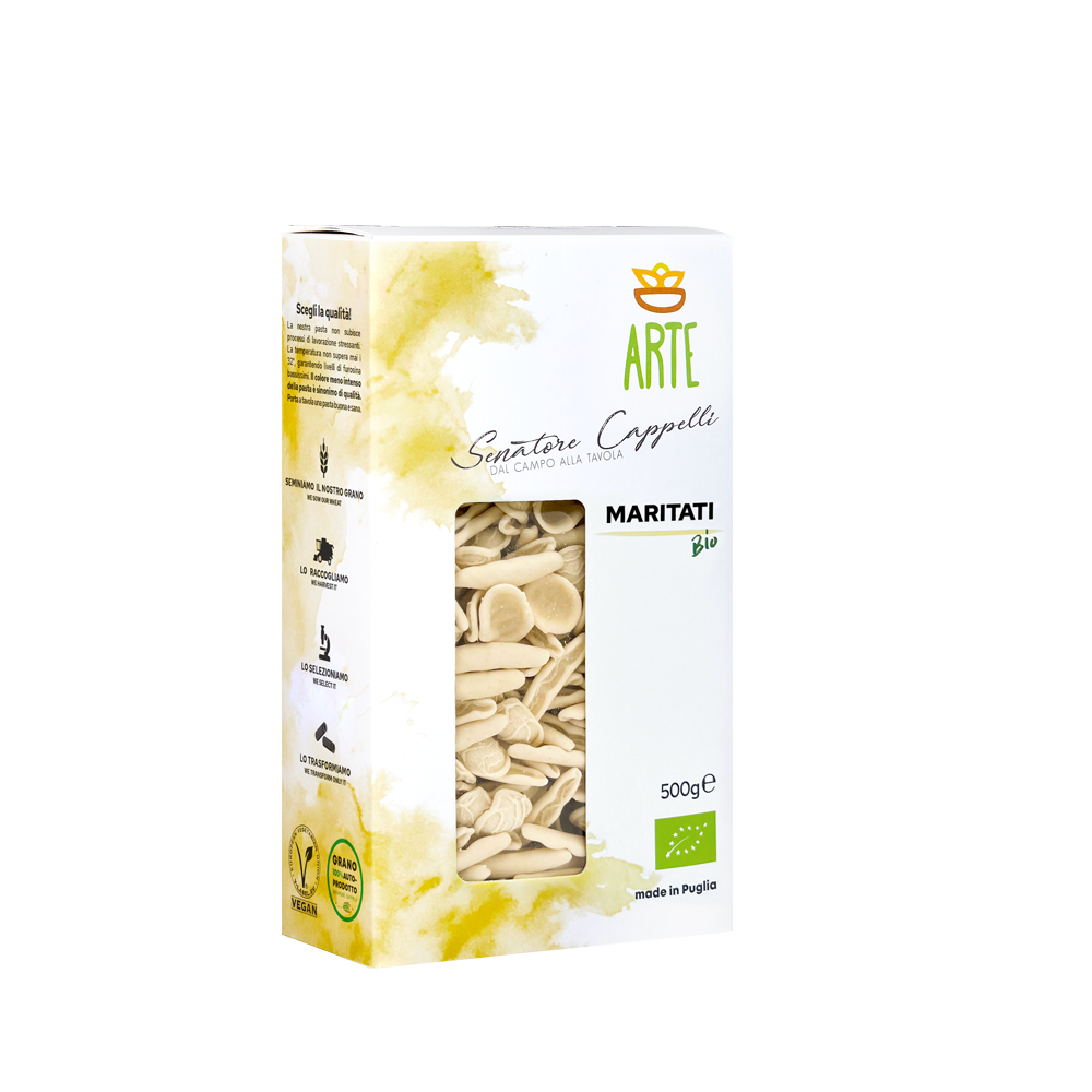 Pasta di semola di grano duro biologico Senatore Cappelli autoprodotto sui campi dell'Azienda Agricola Arte, trafilatura al bronzo e lentissima essiccazione sotto i 32° C.