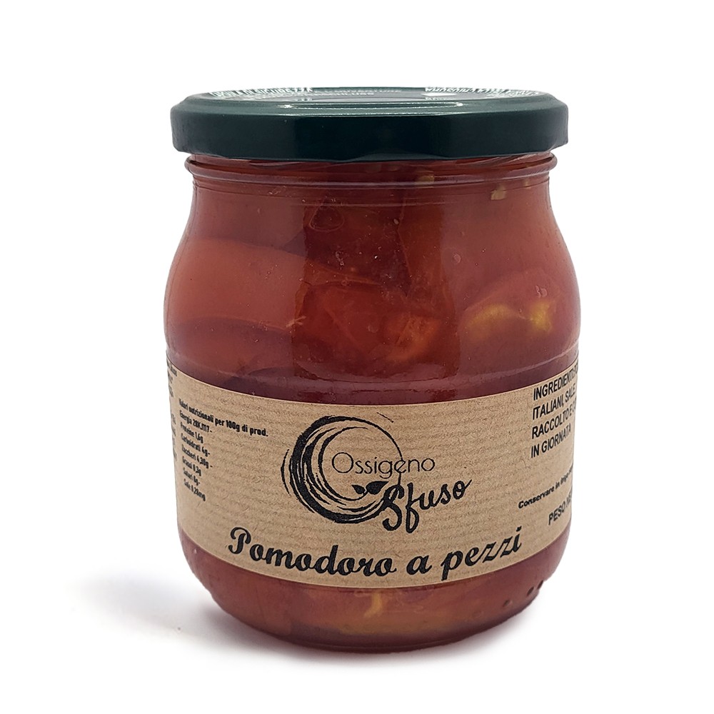 Pomodori a pezzi, dolci e gustosa. I pomodori provengono da agricoltura biologica e sono stati raccolti e confezionati in giornata.
